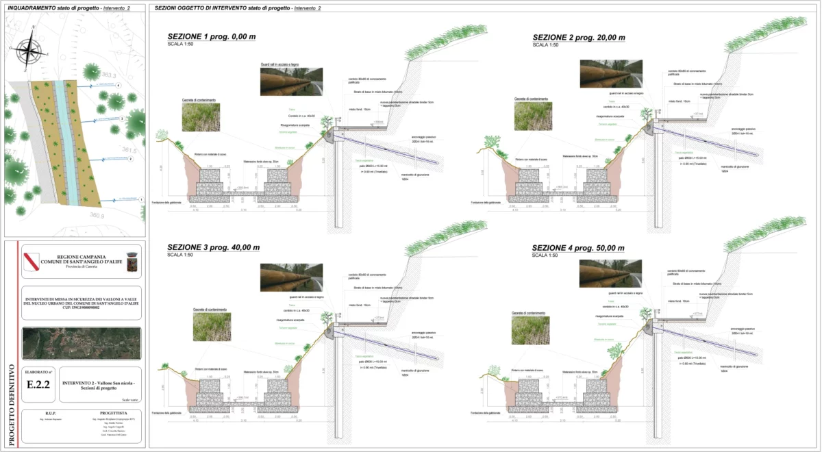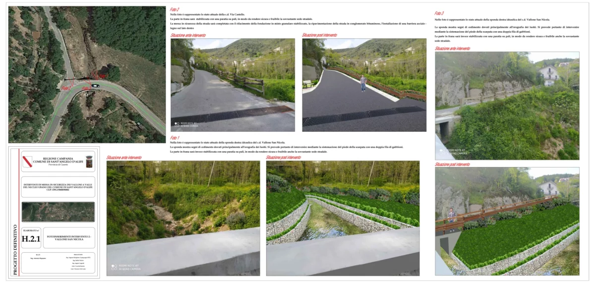 Il progetto ha riguardato la messa in sicurezza dei valloni situati a valle del centro abitato di Sant’Angelo d’Alife. Gli interventi hanno avuto lo scopo di stabilizzare queste aree naturali, riducendo il rischio di frane e di erosione del suolo, per garantire una maggiore sicurezza per la comunità e l’ambiente circostante.